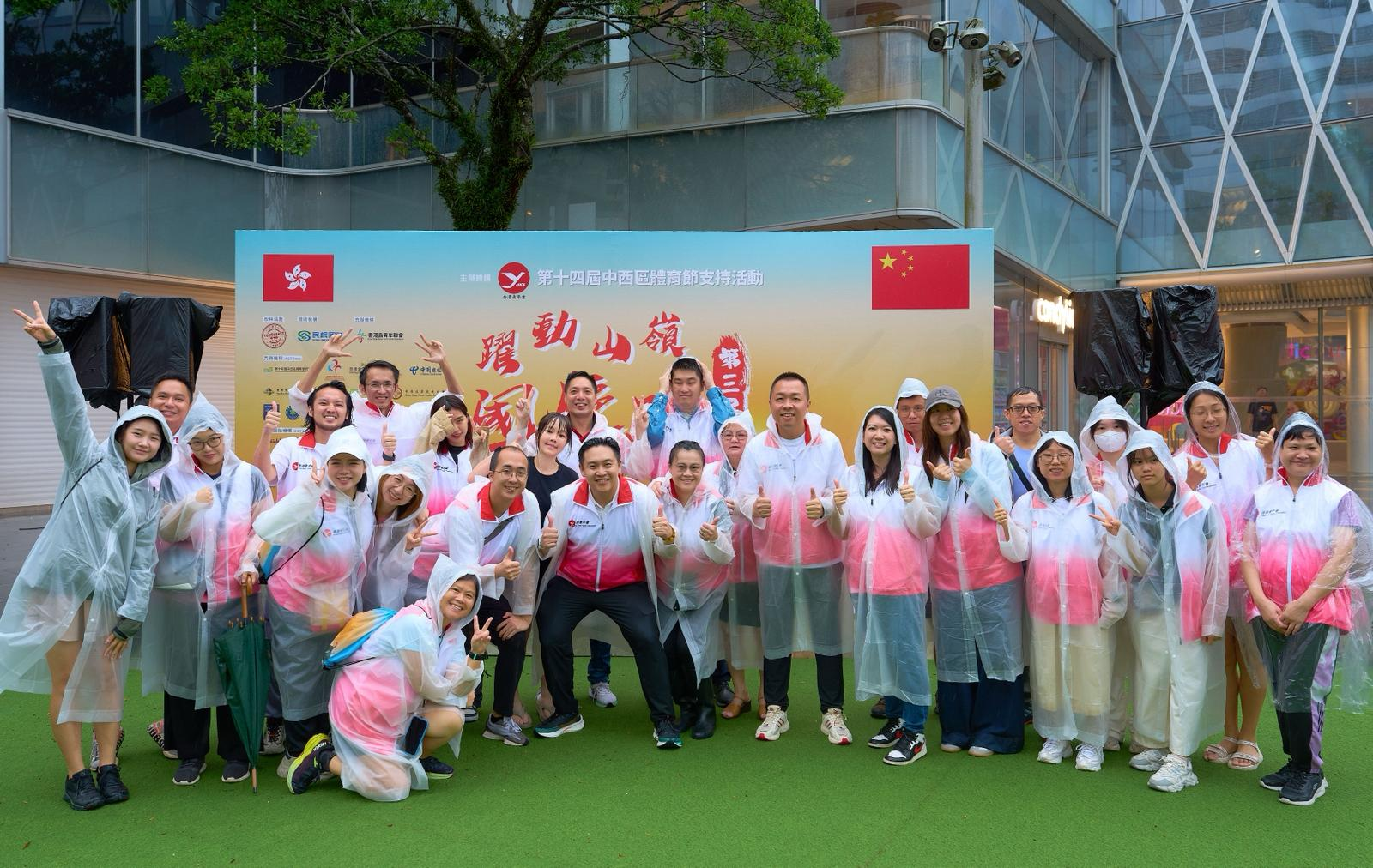 當日主禮嘉賓有中央人民政府駐香港特別行政區聯絡辦公室港島工作部副部長楊成偉先生、民政及青年事務局青年專員陳瑞緯先生、香港警務處西區警區指揮官葉嘉儀總警司、香港警務處中區指揮官林穎濠署理總警司、中國香港足球總會會長及中國香港群眾體育聯會會長貝鈞奇先生S.B.S., M.H. 、第十四屆中西區體育節統籌委員會執行主席林振風先生M.H. 、中國電信國際有限公司總經理尹進先生、民銀資本控股有限公司副總經理郭基智先生、中西區區議員張宗先生、上海浦東發展銀行香港分行行長賈紅睿先生等等;支持機構嘉賓代表有香港中國企業協會常務副主席張琪騰先生M.H. 、香港島各界聯合會中西區地區委員會主席羅錦輝先生、香港區家長教師會聯會常務副主席劉穎欣女士、匡智會副總幹事(服務)李鳳儀女士、善導會高級經理、香港傷健共融網絡創辦人及總幹事莫儉榮先生及碳中和協會主席周子軒先生等等親臨出席,參與開幕及鳴槍儀式。現場超過六百名青年及市民熱情參與,氣氛高漲。民銀資本控股有限公司副總經理郭基智先生指出:作為本次國慶活動的贊助方,我們感受到香港不同年齡群體的蓬勃活力。關愛共融是社區核心議題,這次活動充分彰顯社會各界齊心協力,共同推動包容發展。